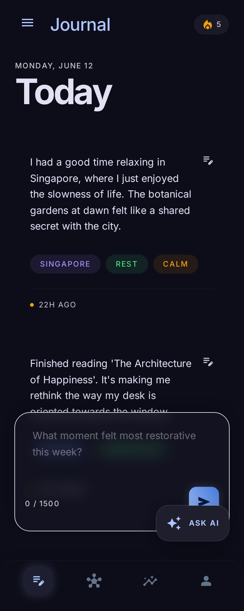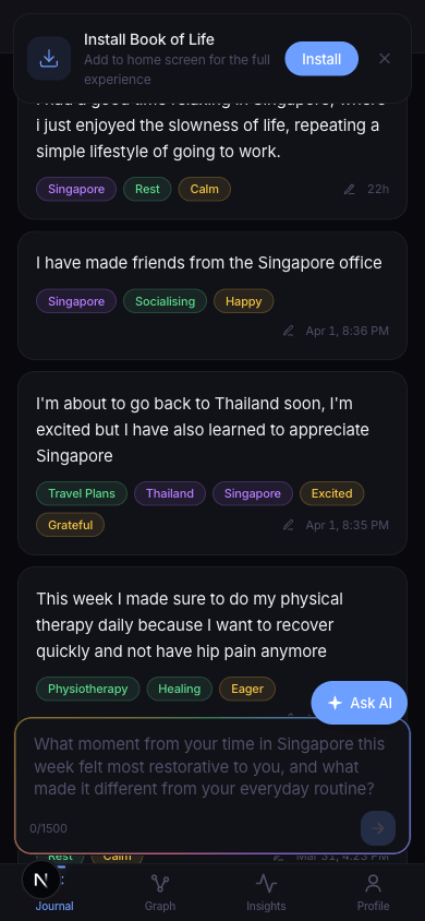 The process went like this: I'd design a screen in Pencil through Claude Code, tell it to view the screen via the MCP integration, critique it, redesign. For each screen I thought carefully about what data we actually have, what belongs on which page, and what doesn't earn its place. A lot of things got removed — mood charts that didn't communicate anything, entity ribbons that duplicated information already visible in each entry, profile stats that were meaningless to users (like "47 entities").