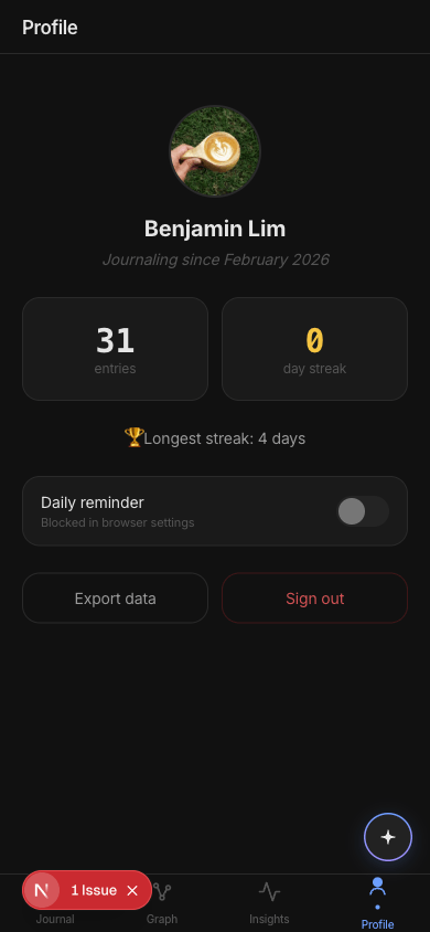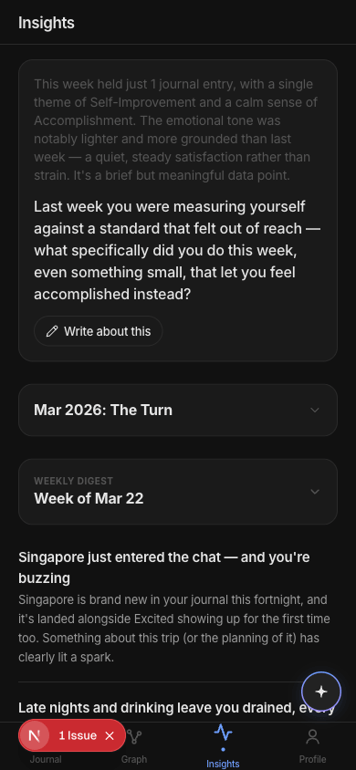 It did invent some features worth stealing. The "Emotional Weather" chart — I already store valence and arousal data on every emotion entity, so a mood sparkline over time is actually a great idea. It also had "Record Answer" buttons on reflection questions, which would let users respond directly from the insights page. And contextual AI suggestions instead of static hardcoded prompts. I added all three to my TODO.