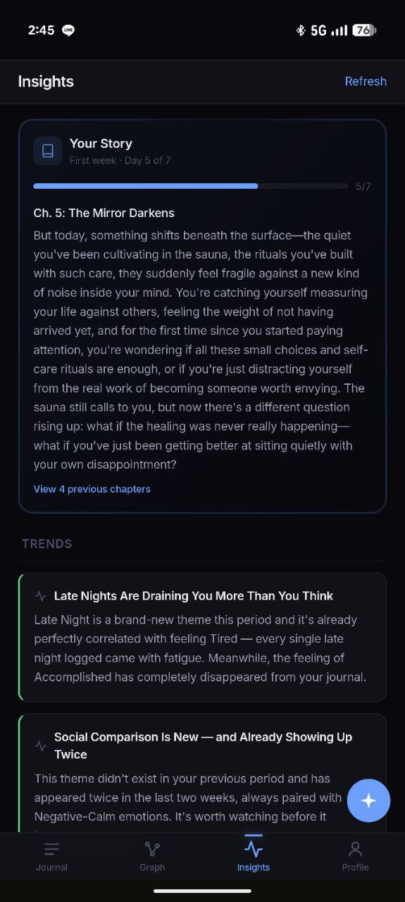 The insights are really impressive. I've been journaling about going to the sauna a lot, and about feeling like I haven't arrived yet. The app generated this story chapter that said I might be distracting myself with self-care rituals rather than sitting quietly with my own disappointment. That one hit different. It also caught that every single late night I logged came with fatigue, and that social comparison is a new theme that's already showing up paired with negative emotions.